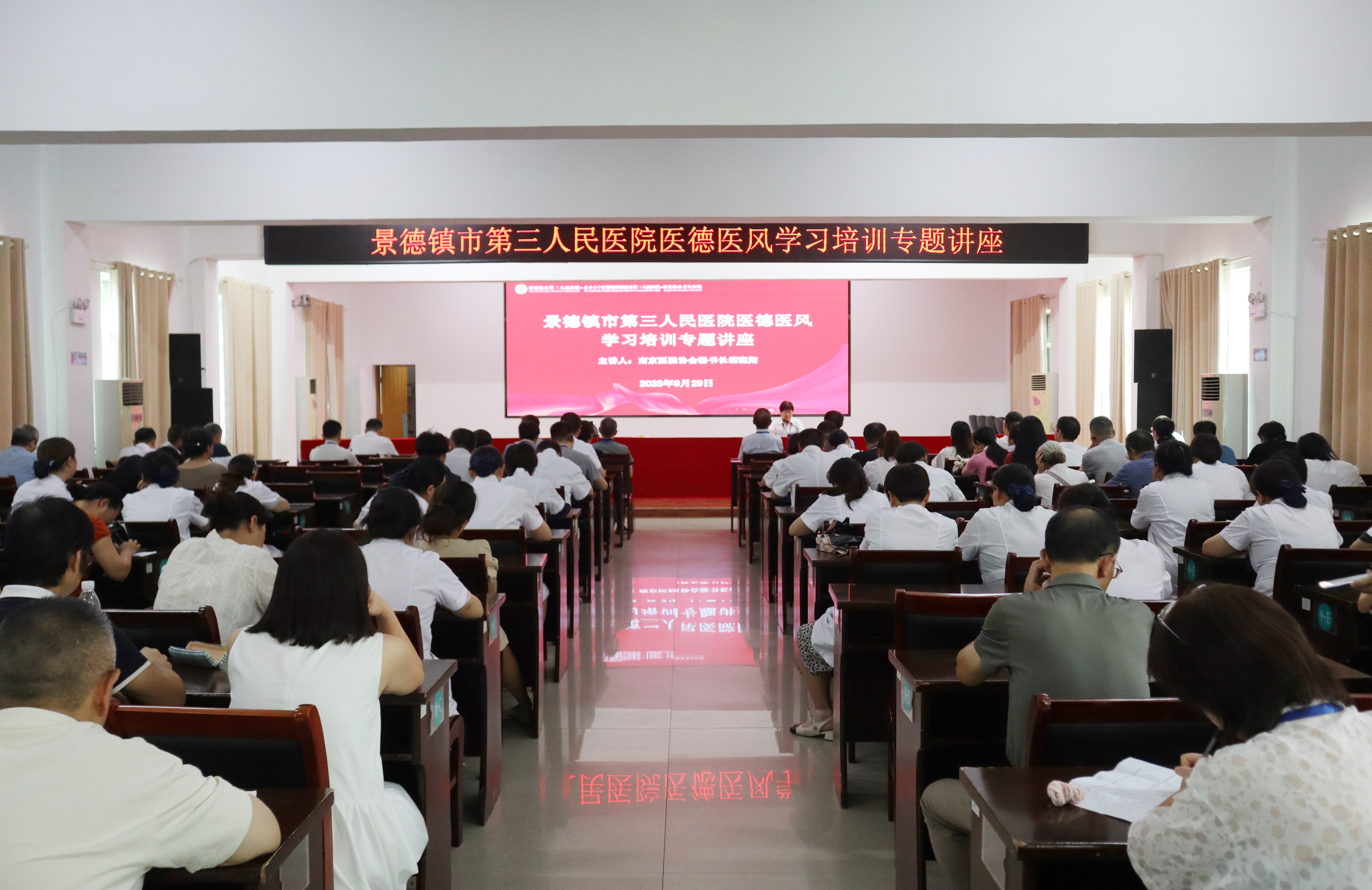 为深入学习贯彻习近平总书记关于医德医风建设的重要论述精神,全面落实中央、省委、市委及市卫健委关于集中整治医德医风有关问题工作的部署要求,进一步强化全院职工职业道德素养,提升医疗服务质量,营造风清气正的医疗环境,9月29日下午,市三院在医院多功能会议厅举办 “敬佑生命 德术并举”医德医风学习培训专题讲座。院领导、各党支部书记、临床医技及行政后勤负责人、科室护士长、保安保洁负责人及实习生代表等齐聚一堂,共同接受医德医风与职业素养的深刻洗礼。会议由副院长龚小云主持。