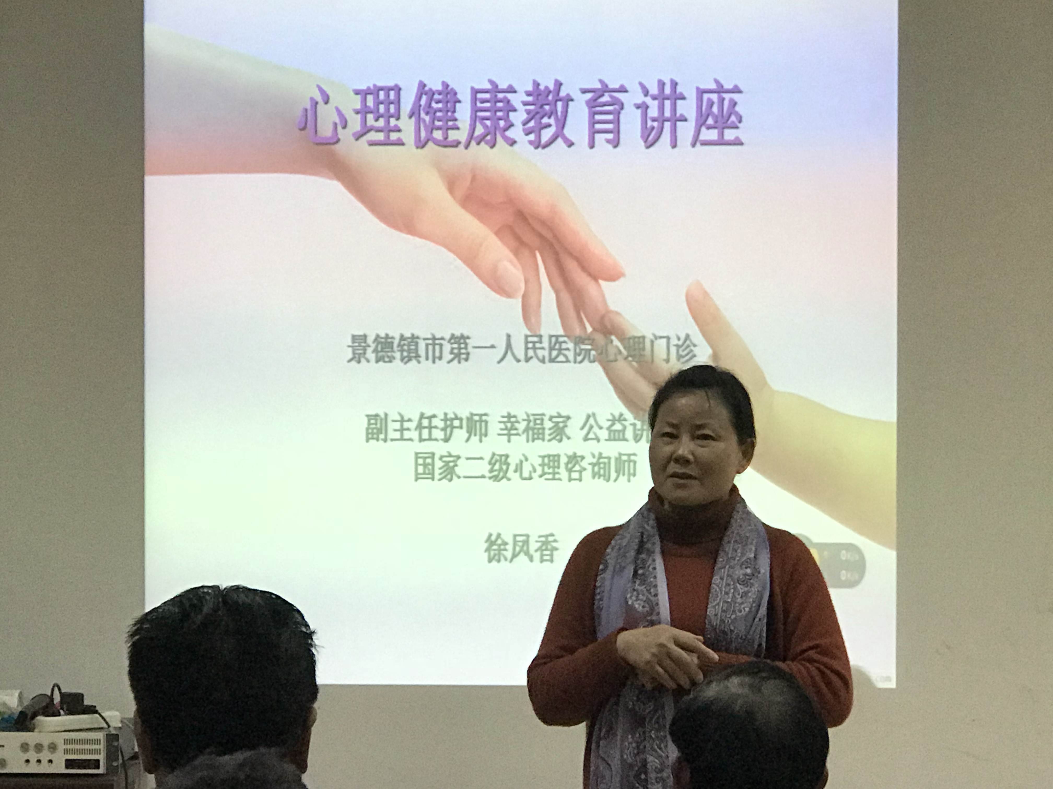 来自景德镇市第一人民医院心理门诊的国家二级心理咨询师徐凤香医生为社区居民进行讲授。徐老师用生动热情、通俗易懂的语言,围绕居民群体心理健康存在的主要问题及相关因素,通过分析现状、讲解成因、现场提问等多种形式,向大家介绍了正确的健康观念,讲解了心理健康知识及负面情绪的危害及如何消除负面情绪,为社区居民传授心理健康知识和心理疏导的基本方法和技巧,并通过互动小游戏和现场答疑环节,让大家学会自己面对并妥善处理好生活中遇到的个人问题,给大家很好的启发和帮助。