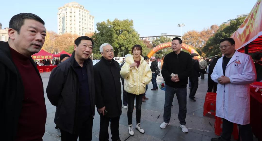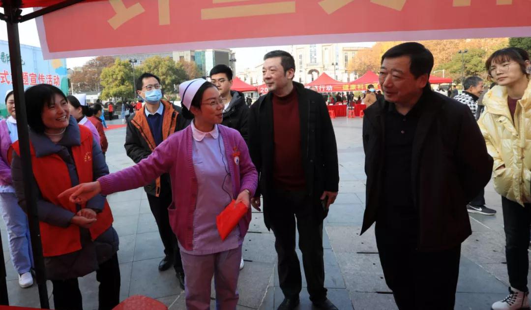 12月8日上午9点,我市休闲广场中心区域引来了许多市民的围观,原来是市卫生健康委员会在此开展了“健康中国行 律动赣鄱地”主题宣传活动。本次活动由市卫生健康委员会主办,市爱卫办、市计划生育协会、市健康教育所承办。主题为“倡导健康文明生活方式 ”,旨在进一步推动健康景德镇行动,大力开展健康知识普及行动,传播普及健康素养基本知识与技能 ,巩固提升新冠肺炎疫情防控成果,引导全社会树立正确健康观念,不断提升全民健康素养和健康水平。市卫健委二级巡视员朱长安、党组成员胡继伟出席并看望现场工作人员。