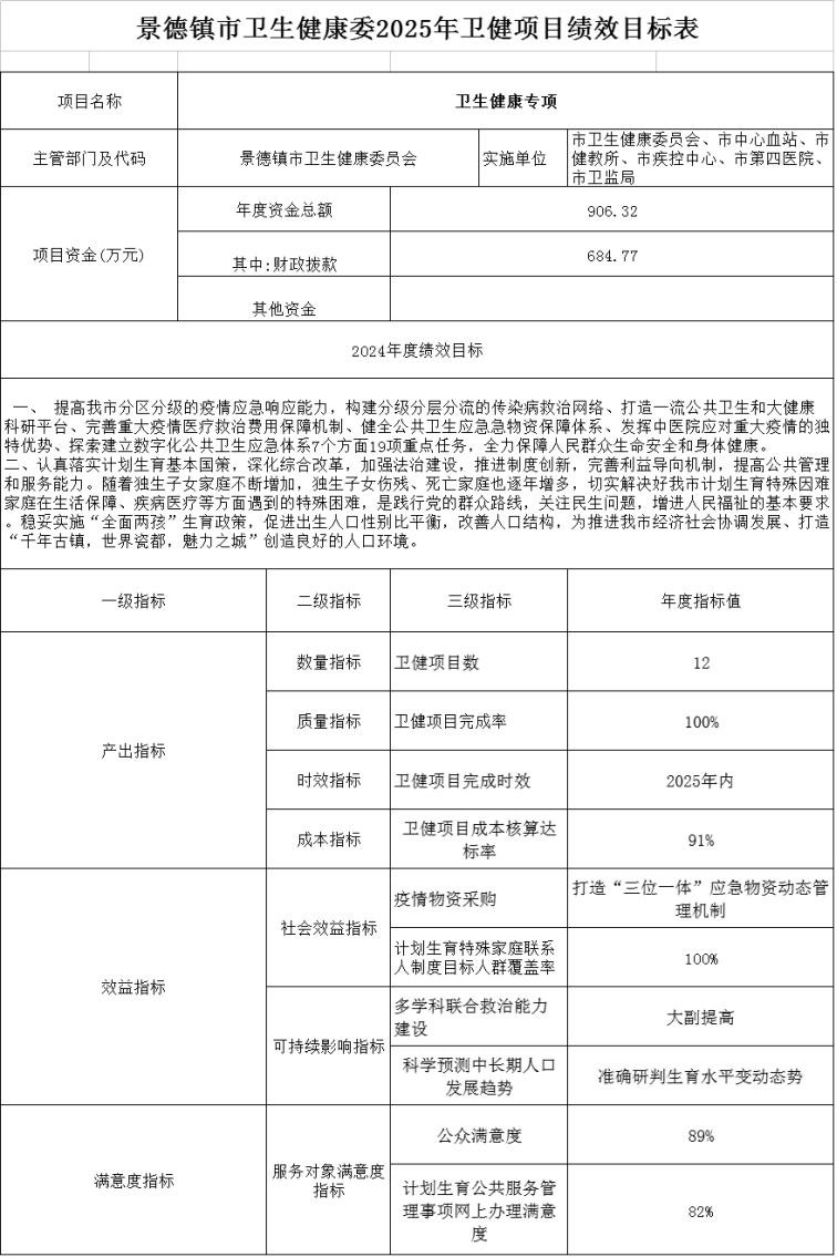 年度预算安排、绩效目标和指标(见附表:2025年卫健项目绩效目标表)