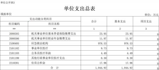 按支出项目类别划分:基本支出1044.92万元,较上年预算安排减少8.68万元;其中:工资福利支出509.86万元,商品和服务支出312.48万元,对个人和家庭的补助31.08万元,资本性支出191.50万元。项目支出0万元。