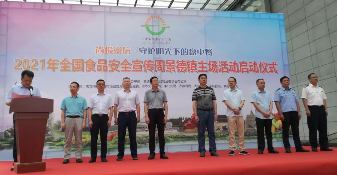 6月22日上午,2021年全国食品安全宣传周景德镇主场活动在金鼎商业广场启动,今年食品安全宣传周主题是“尚俭崇信,守护阳光下的盘中餐”。启动仪式由市食安办主办,市文明办、市市场监管局、市卫健委、市农业农村局、市公安局、市教育局、市商务局、市科技局、景德镇海关协办。市、县两级食品安全执法监管人员和食品生产经营企业代表共计80余人参加。