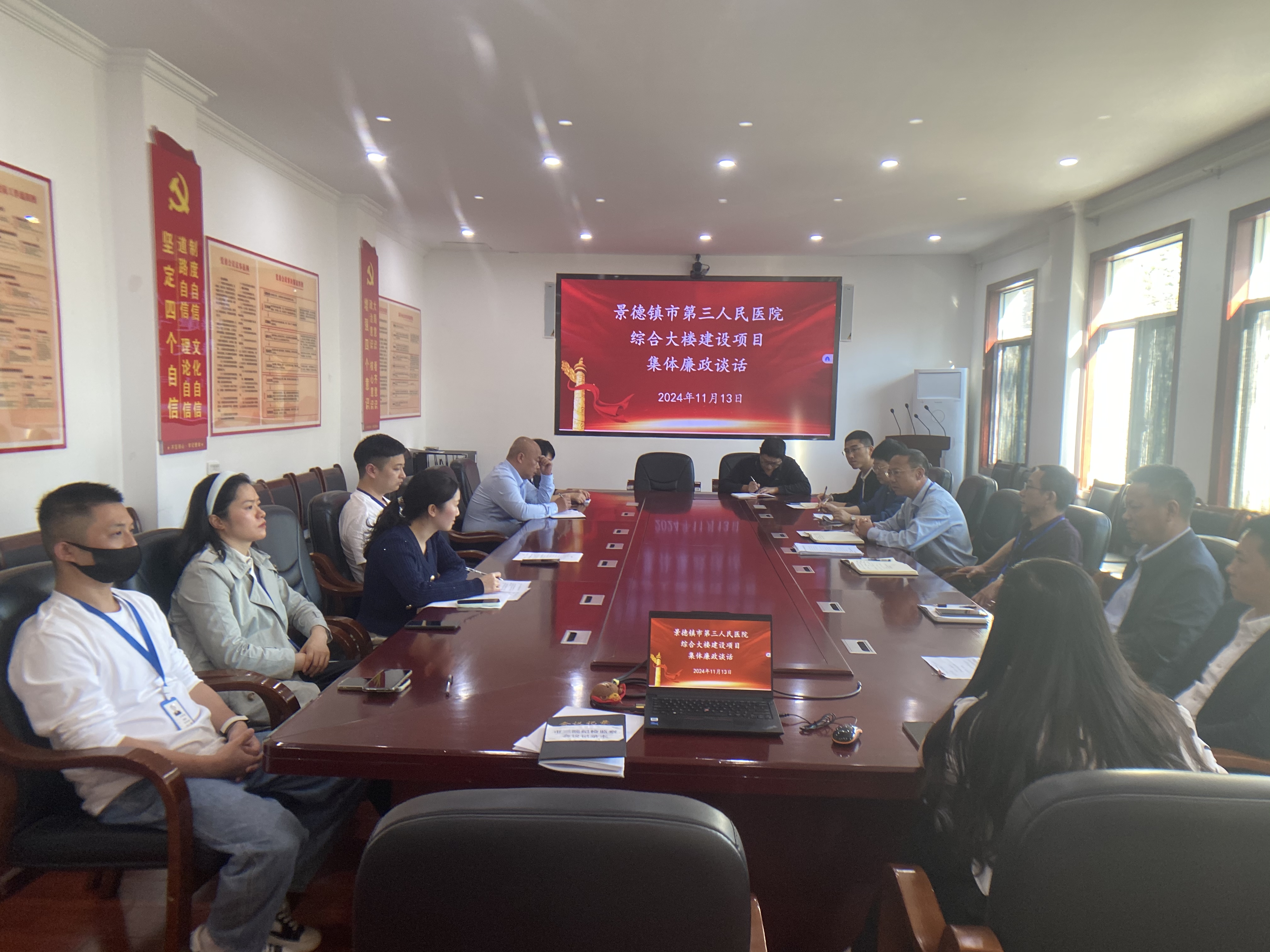 近日,景德镇市第三人民医院纪委在行政会议室召开医院综合大楼建设项目集体廉政谈话,医院党委书记利新发,党委副书记、院长俞成叙出席会议。