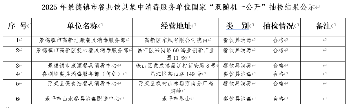 2025年景德镇市餐具饮具集中消毒服务单位国家“双随机一公开”抽检结果公示